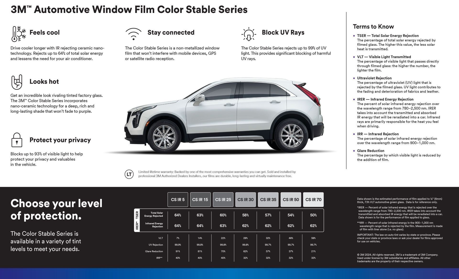 The ultimate in performance and clarity, the 3M Crystalline Series rejects more heat than many darker films—without darkening your windows. It blocks up to 99% of UV rays and up to 97% of infrared heat, offering unmatched comfort, visibility, and protection. Ideal for drivers who want maximum performance with a clear, factory look.